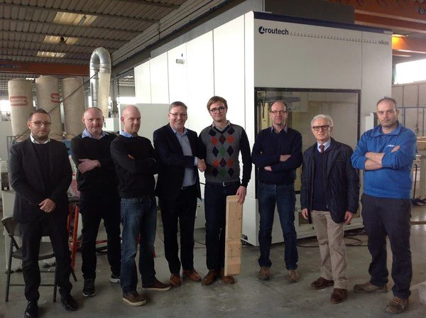 Mi Casa NV visited the Routech facility in Sinalunga for the latest check-up on the 6-axis cnc Routech Oikos before installation. The beautiful New-England-Style Mi Casa Architecture will soon be hallmarked with the high-tech solution by Routech. Mi Casa NV, is a Belgian woodworking company that started up in 1993 building wooden houses. It has grown into a brand that stands for high quality houses with beautiful American New-England-style architecture and cosy interiors. Today a team of 50 people complete between 50 to 60 solid-wooden houses yearly in whatever style a customer wants. http://micasa.be/bouwsystemen/bouwproces.